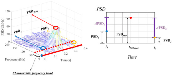 PSDmax is the peak of maximum power spectral density (Figure 11). PSD1 is the initial PSD of the characteristic spectral band (0–50 Hz), where PSDmax is located. PSD2 is the final PSD of the characteristic spectral band (0–50 Hz).