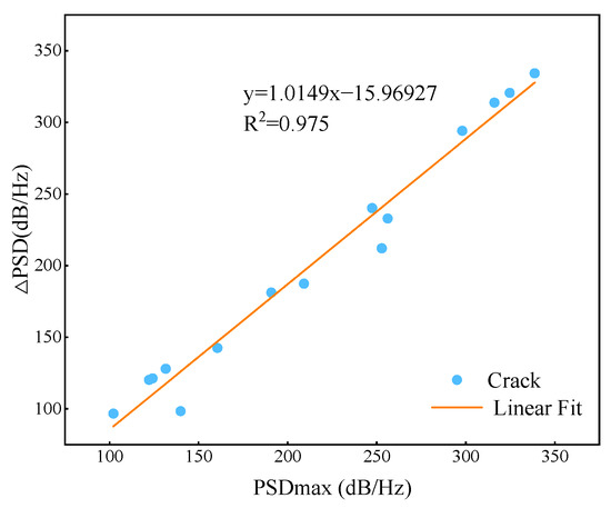 The fitting function between PSDmax and ΔPSD at cracked sections.