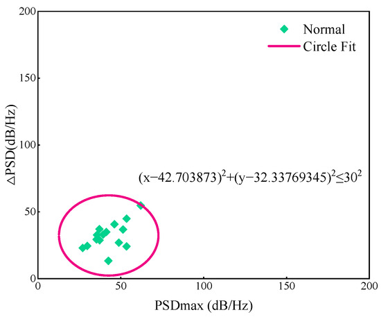 The two key classification features generated, PSDmax and ΔPSD, are mathematically linearly related. This is because the equation of the ΔPSD shows that the difference between the two variables is a linear function. For the same highway, the frequency changes due to the relative equilibrium of the roughness are small compared to cracks. Therefore, the difference is relatively stable. This fitting process is shown in Figure 12. The stability of features at normal sections is similarly verified in Figure 13. The ΔPSD at normal sections presents an agglomeration phenomenon. The data mean of this group was defined as the coordinate origin, and the radius was defined as the distance from the farthest point that makes up the circle function. All samples are strictly confined within this circle function.