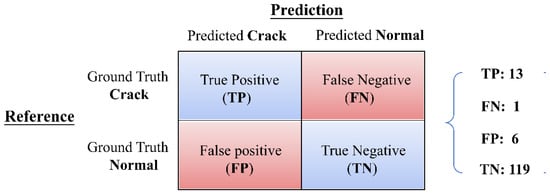 The classification thresholds were set for 100 dB/Hz (PSDmax) and 95 dB/Hz (ΔPSD). If the PSDmax > 100 dB/Hz and ΔPSD > 95 dB/Hz, it is judged to be a transverse crack, and otherwise is classed as normal pavement. We applied this criterion to a large verification set of 139 sections (crack: normal = 14:125). The confusion matrix is shown in Figure 16.