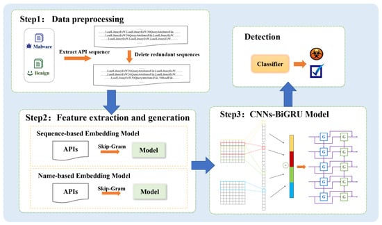 API calls usually describe the semantic execution of a program. The program’s behavior can be described by analyzing the relationships between API calls and determining whether a file is malicious. Therefore, in this article, we represent the semantics of the procedure on the basis of API calls. In this section, a description of the working principle of our proposed malware detection method is presented. The system we propose is shown in Figure 1 and has three phases: data preprocessing phase, feature extraction and generation phase, and model detection phase. We shall describe these phases in the following subsections in detail.