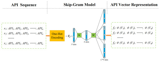 First, each API call is vectorized using the One-Hot algorithm, and each vector’s length V is the amount of unique APIs counted. Row number of the element corresponding to the index position of a word in the vocabulary is 1, and other elements are 0. Then, word embedding is performed. According to the index mapping, each word is mapped to the N-dimensional space so that all words can be mapped to the matrix , where every column in the matrix matches a word. Finally, the output is multiplied with the weight matrix , to acquire a probability distribution. The ultimate goal of model training is to obtain a weight matrix W, in which each row represents a lower dimensional vector of different APIs. In this way, the sequence r in which each API is expressed as a lower dimensional vector . And for out-of-vocabulary (OOV) words, we use ‘0’ as padding.