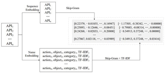 An efficient way to describe the semantic information of API names was presented by Li et al. [], who designed an ‘action’ dictionary to extract its operations from each call, and the remaining part after extraction is used as the ‘object’ of its operations. We improve this by redescribing the API based on the feature representation of Li. Each API name consists of multiple words, and we extract from the API name the string that reflects the API operation and the object of the operation. The cuckoo sandbox (https://github.com/cuckoosandbox/cuckoo/wiki/Hooked-APIs-and-Categories, accessed on 11 January 2022) tracks a total of 312 API calls belonging to 17 categories. We obtain their categories based on the API classification criteria offered by the cuckoo sandbox, and divide the API calls into 18 categories, as shown in Equation (3). In this way, the action, object, and category for each API name are sequentially arranged to form a sequence, which is used as input to generate API name features with the same idea as API sequence embedding. Thus, the name embedding will be closed for APIs that exhibit related behaviors in the sequence.