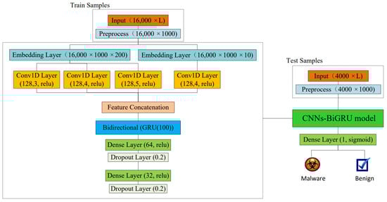 We apply the CNNs-BiGRU model to build a malware detection model, which includes a deep learning architecture consisting of convolutional layers with multiple convolutional kernels of different sizes and bidirectional GRUs. Figure 4 shows a detailed description of the CNN-BiGRU layers used for malware detection.