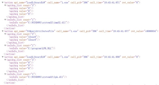 To verify our approach, we use a dataset generated through Sandbox and openly available in Github (https://github.com/kericwy1337/Datacon2019-Malicious-Code-DataSet-Stage1, accessed on 11 January 2022) provided by a third party. It contains execution traces of PE files with 20K entries in total. Among them, 10K are from malicious Windows PE files and the rest are benign. Figure 6 displays a snippet extracted from the XML file output generated after subjecting an executable (exe) file to the sandbox environment.