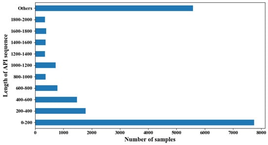 Figure 7 shows the distribution of the extracted API sequence length for each file. The API sequence length of approximately 60% of all files was less than 1000, and the other lengths are scattered over a wide range and memory overflow occurs during training as the API sequence length increases. Therefore, in this study, the maximum length of API sequences was limited to 1000.