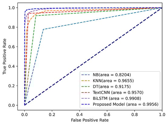 Figure 8 plots the ROC curves [] of various approaches over the test dataset, which represents the false positive rate (FPR) on the x-axis and the true positive rate (TPR) on the y-axis. Area under ROC curve is defined as AUC; the larger its value, the better the classifier works. It can be observed that our model obtains the best AUC score among all the baseline models of the test dataset, and the proposed model obtains a high TPR even with a low FPR.