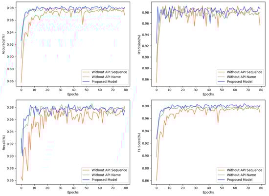 As shown in Figure 9, the absence of any part causes the model’s performance to degrade, indicating that each feature we deal with has a will impact on our test model. The model that combines both features achieves the highest performance, especially with respect to accuracy and F1-Score, significantly better than the other two sets of experiments. It is significant to note that the module lacking information regarding the semantics of the API sequence obtained the worst performance, indicating the importance of semantic information about API call context.