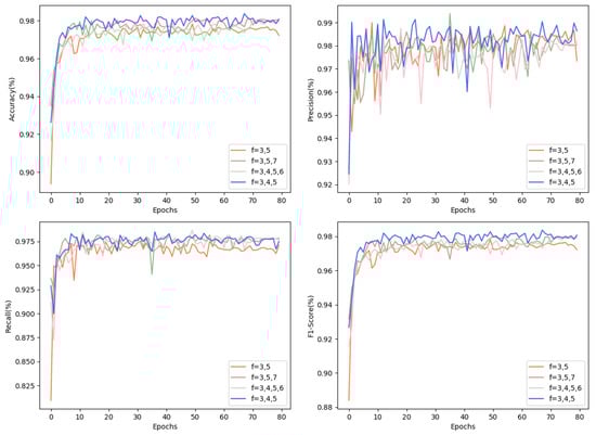 For the application of the number of convolutional layers, Figure 10 illustrates the performance for each configuration. The convergence is slower and the final performance is poorer when the convolutional layer size is 2. The model performance is higher when the number of convolutional layers is 3 than when it is 2. Among them, the patterns with filter sizes of 3, 4, and 5 have higher performance than those with filter sizes of 3, 5, and 7. In addition, the performance does not bring improvement as the convolution layer count grows from 3 to 4. Therefore, we chose a three-layer convolutional layer structure in our model with applied filter sizes of 3, 4, and 5.