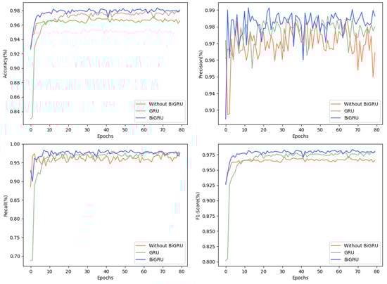 Figure 11 illustrates a comparison of various numbers of GRUs. It is clear that BiGRU model has significantly better accuracy, recall, and F1-Score than the other two models, which indicates the importance of BiGRU for this detection model. It is noticeable that as the quantity of GRUs grows, the convergence of the model gradually accelerates and the performance improves, reflecting that learning the contextual relationship of API calls helps improve the model’s performance.