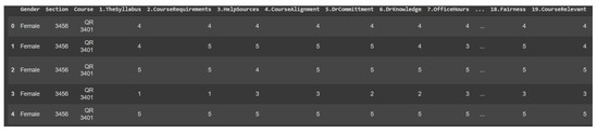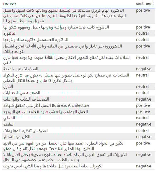 The dataset used in this study was collected from PSAU, specifically from the College of Computer Engineering and Sciences (CCES) via student course evaluation surveys post-COVID-19 (refer to Figure 1). The data was gathered by the quality unit of CCES, resulting in a total of 384 records and 30 features from 30 different courses spreading across 66 sections. Figure 2 provides a sample of the dataset used. The features include both categorical and quantitative variables, as well as textual comments. Table 1 provide a translation of the Arabic comments provided in Figure 2. Table 2 provides an overview of the extracted features and their descriptions. We highlight that the proportion of class labels in our dataset refers to the distribution of different categories or classifications within the data. For instance, in a sentiment analysis task, the class labels is maily considered to be “positive”, “negative”, and “neutral”, each corresponding to the sentiment expressed in a piece of text. The proportion of these labels would then indicate how many of the entries in the dataset are positive, negative, or neutral, typically represented as a percentage or a count. The proportions of each class within the dataset are as following: