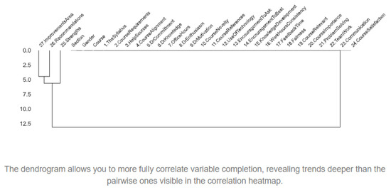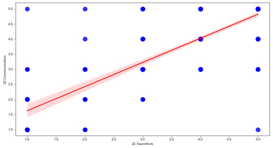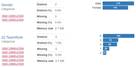 Data exploration, or Exploratory Data Analysis (EDA), is the process of analyzing and understanding the patterns, outliers, and relationships in a dataset. It is a crucial step in any data science project, as it allows us to gain a deeper understanding of the data and make informed hypotheses. One powerful tool for EDA is the pandas profiling library, which is an open-source Python package that allows us to perform EDA quickly and easily with just a few lines of code. Additionally, it generates web reports that can be shared with others, making it an ideal tool for presenting our findings. With pandas profiling, we can save time and effort by easily visualizing and understanding the distribution of each variable in the dataset. It creates a comprehensive report that includes summary statistics (Table 3), tables, and visualizations, making it a valuable tool for data exploration and understanding. Additionally, the report also includes information about missing values, such as the Count, Heatmap, and Dendrogram. The Count chart, shown in Figure 3, illustrates the number of missing values in each feature and the count of it. The Dendrogram, shown in Figure 4, displays the missing values in a hierarchical format. It’s important to note that all missing values are textual in nature, as filling in textual data in the survey is optional. To further understand the relationships between variables (features) in our dataset, we used a correlation matrix. The square matrix is based on the Spearman correlation coefficient, represented by . The correlation value describes the interaction strength between two features. The range of correlation varies from +1 to −1. A positive value indicates a positive association between two features, while a value of 0 means that there is no association between these two features, or the relationship is not linear. Thus, they are independent from other features. The correlation matrix provides a clear picture of the association between features. Figure 5 illustrates the matrix for 24 selected features. Additionally, we created a scatter plot using the Seaborn library to represent the pairwise correlations between the various variables. This is useful in providing a simple summary of how the data is spread and whether it includes outliers. Figure 6 illustrates the scatter plot to display the correlation between the highest positive correlation based on Figure 7 where the red shadow in this figure represents the confidence interval for the regression line, indicating the uncertainty about the line’s true position based on the variability of the data points. This association shows that the teamwork and communication features have a strong correlation coefficient of 0.83.
