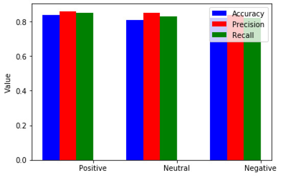 We note that accuracy is the percentage of correctly classified samples, precision is the percentage of correctly classified positive samples among all the positive samples, recall is the percentage of correctly classified positive samples among all the actual positive samples. The suggested SVM-SAA-SCR has the ability to classify sentiments using a small training set (PSAU dataset). It has also shown strong competition in achieving a high accuracy of 84.7%. The detailed performance results based on the PSAU dataset are detailed in Table 4 and Figure 8