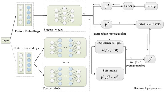 Knowledge distillation operates within a teacher–student framework, where the practice structure is typically a well-trained model serving as a source of knowledge for learning. The student model gains the teacher model’s knowledge through distillation training, with a potential slight performance loss traded for transferring knowledge from complex teacher models to a simpler student model. Currently, most instances of knowledge distillation focus solely on a single teacher model, overlooking the possibility that a single student model can be supervised by multiple teacher models [20,21]. Alternatively, recognizing the equal significance of multiple teacher models renders it impractical to acquire more valid knowledge based on inherent distinctions in these models. To enhance model accuracy, the knowledge distillation model, typically involving a single teacher model, was expanded to include multiple teacher models. Consequently, a student model can now be trained by several teacher models, enabling the acquisition of valid knowledge aligned with the interior differences among the models. In this study, the teacher model comprised state-of-the-art models such as DeepFM, the DCN, and xDeepFM, while a user-defined neural network model formed the student model. Within this framework, the student model can autonomously learn the importance of different teacher models for a given data sample and integrate this knowledge based on learned diverse degrees of importance. This approach significantly contributes to enhancing the learning capability of the student model [22]. The primary structure of this teacher–student model is presented in Figure 1 below: