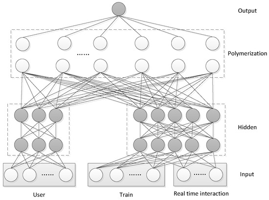 The proposed student model, outlined in Figure 2, mainly comprises an input layer, a hidden layer, an aggregation layer, and an output layer. Furthermore, the output layer consists of three features, namely a passenger feature, a train number feature, and a real-time interaction feature. The hidden layer was divided into two parts; passenger feature data and the train number feature data were subjected to embedding in the hidden layer. The embedding structure for the train number feature involves its fusion with the real-time interaction feature. Afterwards, feature fusion was fulfilled by virtue of full connections at the aggregation layer. In the fully connected layer, each neuron was connected to all of the neurons of the previous layer, and there was a certain connection weight between each input feature and each neuron. The input feature space was mapped to the output result space, thereby achieving the complexity and nonlinear fitting ability of the model. For the features fused, multi-level operations were performed. After computations were performed on these operation results, the predicted values were obtained.