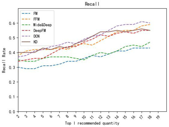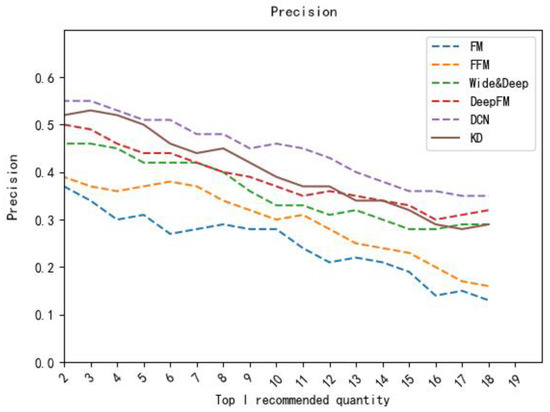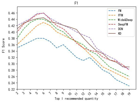 Evidently, the recommendation results of the five algorithms tested exhibit varying indices. As shown in Figure 3, Figure 4 and Figure 5, the deep learning-based recommendation model outperforms other models like FM and FFM in terms of precision, recall rates, and F1 scores. Particularly in F1 scores, the proposed KD recommendation model demonstrates certain advantages among the evaluated recommender systems but still lags behind deep learning models, which is especially the case for the DCN.