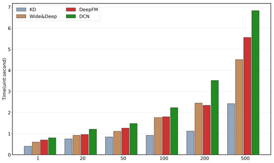 Concurrency testing results are illustrated in Figure 6. Upon the deployment of Wide&Deep, DeepFM, the DCN, and KD models on identical cloud and terminal devices, the KD model exhibits significantly superior dynamic computing time and concurrency compared to other models, including Wide&Deep and DeepFM. Moreover, the cost of model deployment is notably reduced.