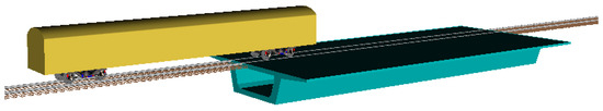 Based on the multi-rigid body system dynamics theory, the subway A-type vehicle is mainly considered as a multi-rigid body system with the vehicle body, two bogies and four wheel pairs, and the main motion states of the vehicle structure in the study include the vehicle body, the front and rear bogies’ sinking and nodding motions, and the pendant vibration and nodding of the four wheel pairs, with a total of 14 degrees of freedom. The vehicle–track–bridge coupled dynamics model and its dynamics parameters are as shown in Figure 1 and Table 1 and Table 2.
