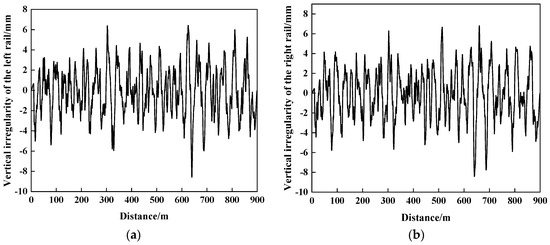 In the numerical simulation, the operating speed of the subway A-type car is established at 83 km/h, and the sixth-grade power spectral density of the American railway is adopted as the external excitation, depicted in Figure 3. The dynamic response of the comprehensive vehicle–track–bridge system is computed, and the resultant node velocities and node forces are employed as input parameters for subsequent power flow analysis.