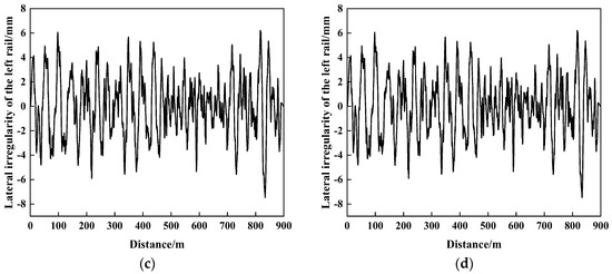 Numerical simulation utilizing the sixth-level spectrum of American railroads: (a) Random vertical irregularity of the left rail; (b) Random vertical irregularity of the right rail; (c) Random lateral irregularity of the left rail; (d) Random lateral irregularity of the right rail.