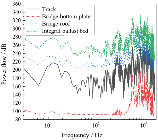 Secondly, the second peak in power flow is observed in the track, integral ballast bed, box girder bridge roof, and bottom plate at around 600 Hz. Among these, the integral ballast bed exhibits the highest cumulative power flow, reaching approximately 300 dB, while the lowest cumulative power flow is found in the bottom plate, at approximately 175 dB.