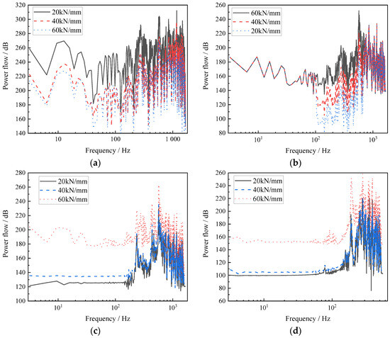 Power flow of track, integral ballast bed, bridge roof, and bridge bottom plate varies with the stiffness of coupler: (a) Power flow of track; (b) Power flow of integral ballast bed; (c) Power flow of bridge roof; (d) Power flow of bridge bottom plate.