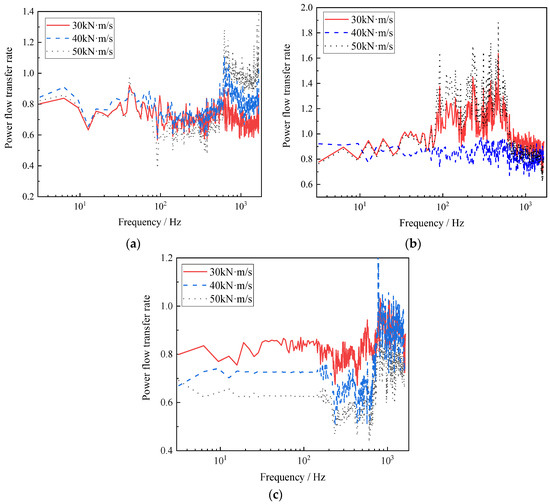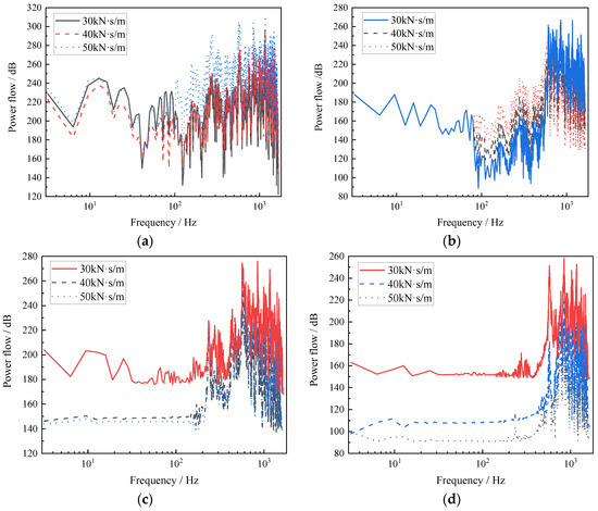 As observed in Figure 6, within the low-frequency range of 0–100 Hz, fastener damping exerts minimal influence on track power flow, and the spectrum curves for the three operating conditions align closely. As frequency rises, the peak values of track power flow emerge at 300 Hz, 600 Hz, 800 Hz, 1200 Hz, and 1600 Hz. Fastener damping significantly impacts the peak values at 600 Hz and 800 Hz, thereby chiefly influencing the power flow transmission characteristics within the high-frequency band for the track.