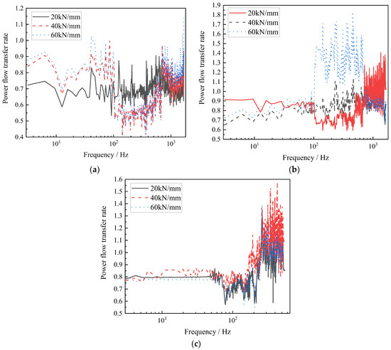 Figure 8b shows that the impact of fastener stiffness on the power flow transfer rate from the ballast bed to the bridge roof primarily occurs in the frequency band above 700 Hz. Within the 100–700 Hz range, vibration energy transfers more readily downward with increasing fastener stiffness. However, in the frequency range of 700–1600 Hz, a smaller fastener stiffness results in a stronger power flow transfer efficiency.