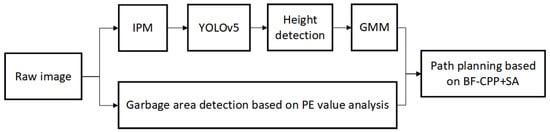 In this paper, the inverse perspective transformation is used to eliminate the perspective effect and obtain the top view of the real road surface, and the YOLOv5 algorithm completes the recognition of single garbage and obstacles. As shown in