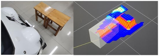 Figure 4, which shows the process of converting our radar point cloud into a local elevation map, the gray rectangle is the vehicle model of this vehicle, and the orange cube is the recognized elevation terrain. Once the height of the garbage pile is detected to be higher than the threshold value, this pile of garbage is determined as an obstacle and the avoidance strategy is executed.