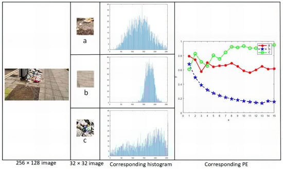 Figure 9c is the complex garbage pile. Then, for each region, the histogram information is extracted based on the histogram information to obtain the potential garbage distribution region. Then, PE entropy calculation is performed for the collection of sequences to obtain the complexity of the sequences. As shown in the line graph of