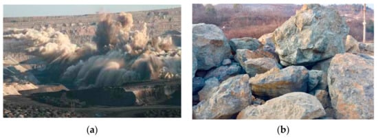 Typical ore rocks formed after mining blasting: (a) Mining blasting operation; (b) Typical ore rocks.