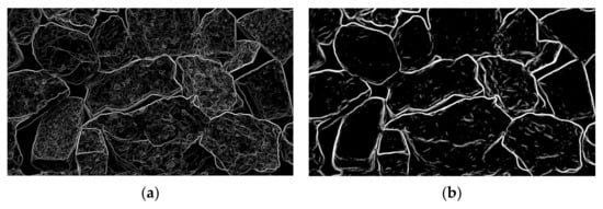 Figure 2 presents a comparison of the gradient map and SDM. From Figure 2a, it can be seen that the gradient map successfully distinguishes the background from the foreground. However, it struggles to effectively differentiate between edges and noise within the foreground, leading to a reduction in the accuracy of rock fragmentation segmentation. In contrast, Figure 2b demonstrates that the SDM significantly suppresses noise, minimizing its interference with the rock edges. This establishes a strong foundation for subsequent edge detection and rock block segmentation.