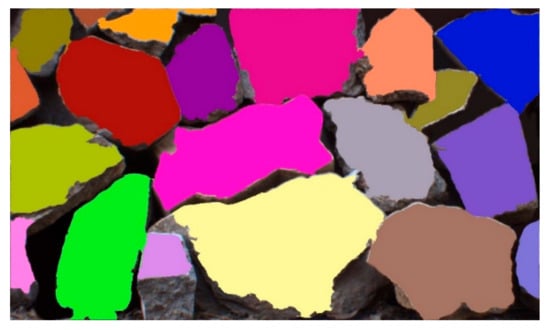 To address the issue of over-segmentation, the Marker Watershed algorithm incorporates marker control to eliminate spurious catchment basins. In this study, we refine the Marker Watershed algorithm by replacing the gradient image with the edge-enhanced SDM. The segmentation effectiveness of rock fragments using this modified Marker Watershed approach is depicted in Figure 5.