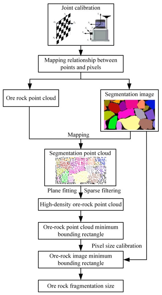To address the aforementioned challenges, this research paper proposes a novel approach that integrates point cloud and image multimodalities for calculating the size of rock fragments. This method capitalizes on the high resolution and comprehensive color–texture information available in the image modality to generate segmented images of ore and rock blocks. Firstly, the mapping relationship between the image and point cloud mode is established based on the joint calibration of the camera and LiDAR. Then, the pixels in the segmented map are dimensionally calibrated using the spatial position information of the point cloud modality. As a result, accurate computations of rock block sizes are achieved. This approach maximizes the fusion potential of point cloud and image multimodalities and effectively utilizes the spatial position information from the point cloud modality, as well as the high-resolution capabilities and texture information from the image modality. By synergistically integrating these modal data, the method overcomes the limitations of relying on a single modality for calculating rock fragment sizes. This integration significantly enhances the accuracy and practicality of the algorithm, leading to improved overall computation accuracy.