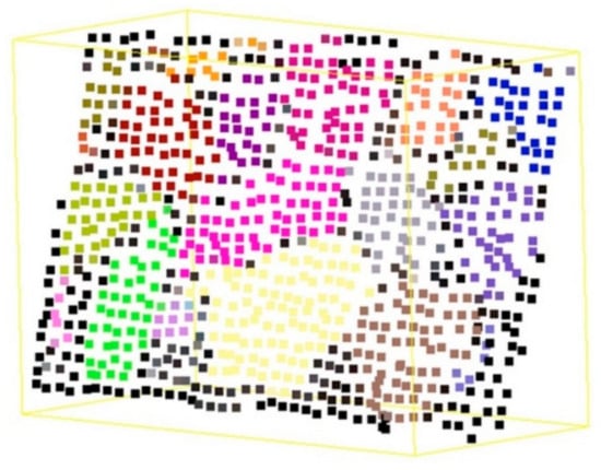 In the subsequent step, the Random Sample Consensus (RANSAC) algorithm is employed to fit planes to the segmented point cloud of mineral blocks. The point cloud is then projected onto these fitted planes, as depicted in Figure 9. The black points represent the background, while points of different colors correspond to different rock formations.