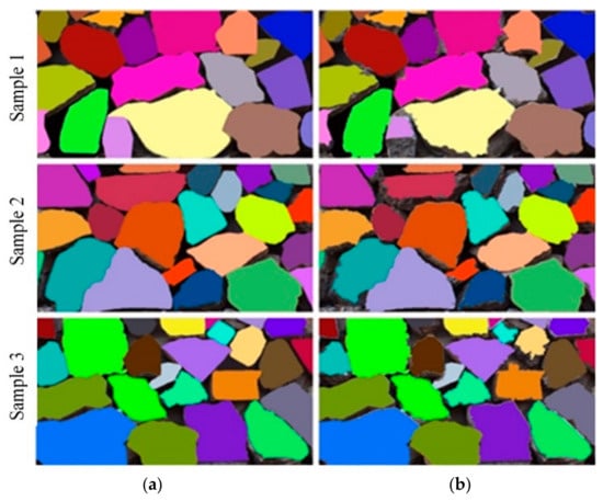 The rock image segmentation results proposed in this paper are presented in Figure 10a, while the ideal segmentation achieved through manual annotation is shown in Figure 10b. It can be observed that the image segmentation method effectively segmented all rock blocks and closely approximated the manually annotated ideal segmentation. This provides a solid foundation for further analysis and the calculation of rock block sizes.