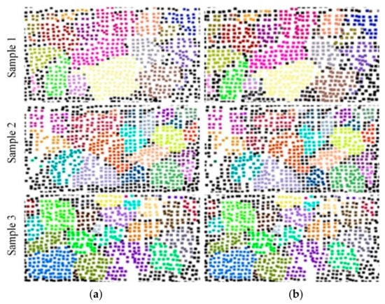 After obtaining the segmentation image of the ore rocks, the ore point cloud is calibrated and mapped, resulting in the segmentation of the ore point cloud. The segmentation results of the ore point cloud using the proposed approach are depicted in Figure 11a, while the manually annotated ideal segmentation effect is shown in Figure 11b. It is evident that the segmentation results obtained from the point cloud closely resembled the manually annotated ideal segmentation of the ore blocks. This demonstrates the accuracy of the pixel size calibration by utilizing the spatial position information derived from the segmented rock point clouds.