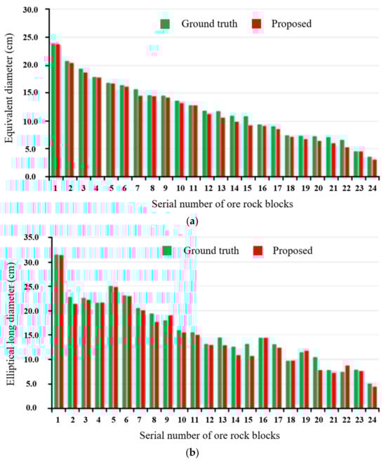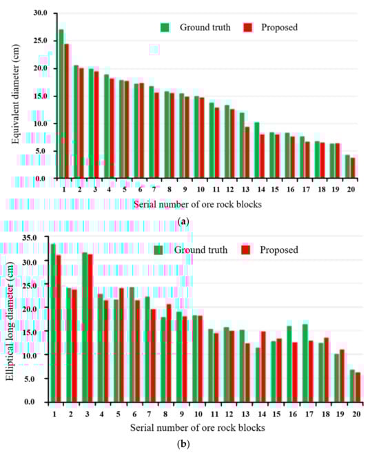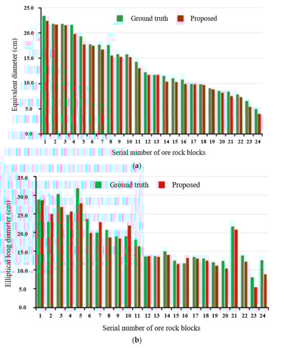 Furthermore, we selected three samples to present the experimental results in more detail by using the equivalent diameter and the elliptical long diameter as the metrics. The computed results for the size of rock blocks in Sample I are presented in Figure 13.