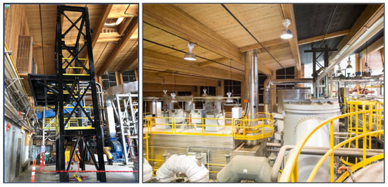 The Bioenergy Research Demonstration Facility (BRDF) is a significant renewable energy generation facility situated within the University of British Columbia’s Vancouver campus. Operating since its completion in March 2012, the BRDF utilizes renewable biomass from wood waste to produce thermal energy for heating various campus buildings. This sustainable approach aligns with the university’s commitment to reduce greenhouse gas emissions, contributing to a 14% decrease compared with 2007 levels [49]. The BRDF’s current system includes a gasification unit generating six megawatts (MW) of thermal energy per hour, satisfying 25% of the campus’ heating and hot water demands. Additionally, the facility houses a cogeneration engine that currently produces 2 MW of electrical energy, meeting over 5% of the campus’ electricity needs, along with an extra 2.4 MW of thermal energy derived from heat recovery processes. The incorporation of innovative technologies, such as Cross-Laminated Timber (CLT) panel construction, showcases the facility’s commitment to sustainability.