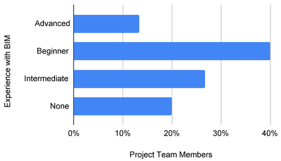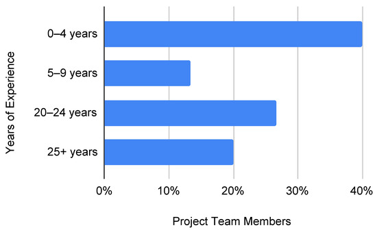 A survey was conducted by the research team to understand the project team’s experience in their discipline, as well as their experience with using BIM. As Figure 5 shows, according to this survey, more than half of the project team members indicated that they had less than 10 years of experience in their domain. More specifically, 40% of the project team had 4 years or less work experience, and the survey also showed that only 20% of the respondents had more than 25 years of experience in their field.