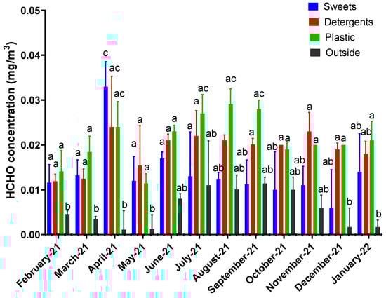 Monthly variations in formaldehyde concentration over one-year measurements in 3 different departments and outside. Data with distinct characters indicate significant differences (p < 0.05), whereas data sharing identical symbols do not exhibit significant differences (p > 0.05). The values are averages of three independent measurements.