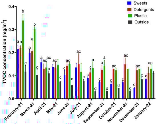 The concentration of total volatile organic compounds was not significantly different for different departments (p = 0.107) (Figure 2). The annual medium values were significantly higher for the detergents and plastics departments (compared with outside 0.14 ± 0.03 mg/m3 and 0.16 ± 0.07 mg/m3, respectively) compared with outside value (0.07 ± 0.03 mg/m3). In the case of the sweets department, the TVOC concentration over the year was not significantly different compared with the outside value (p > 0.05). Generally, the highest concentration of TVOCs was found in February 2021 for all departments (with a maximum of 0.339 ± 0.026 mg/m3 in the plastic departments), while the highest TVOC concentration outside of the store was found in winter (with a maximum in February of 0.117 ± 0.028 mg/m3).