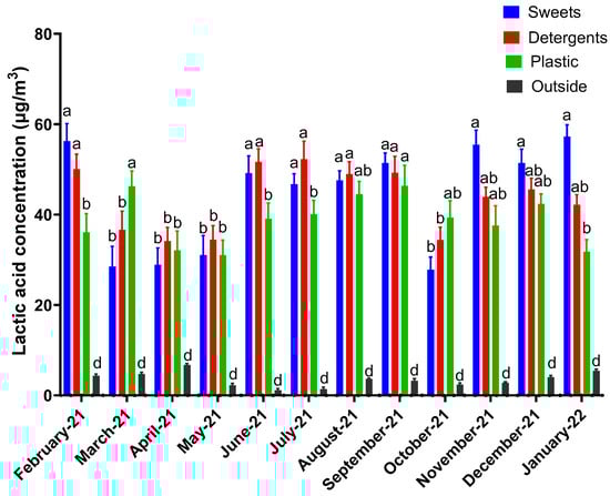 The average values of lactic acid concentration over the year for sweets, detergents, and plastics departments were 44 ± 11 µg/m3, 43 ± 7 µg/m3, and 38 ± 5 µg/m3, respectively, while the outside average value over the year was 3.5 ± 1.7 µg/m3 (Figure 3). There was not a general trend among departments, but from November to February, lactic acid concentrations in the sweets department were significantly higher than in the other two departments. Overall, the lactic acid concentrations were ten times higher inside than outside. The outside concentration of lactic acid varied from 1.15 µg/m3 in June to 6.15 µg/m3 in April.