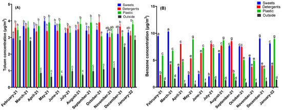 In the case of benzene (Figure 4B), the annual concentration in the sweets department was 6.2 ± 2.9 µg/m3, in the detergents department was 5.79 ± 2.1 µg/m3, and in the plastics department was 6.1 ± 2.1 µg/m3. The annual average outdoor benzene concentration was 1.05 ± 0.32 µg/m3. The highest benzene concentration was found in the sweets department in February 2021 at a level of 10.3 ± 0.1 µg/m3 while the lowest was found in July at 1.99 ± 0.05 µg/m3. Even more, benzene concentrations in different departments vary a lot across the year.
