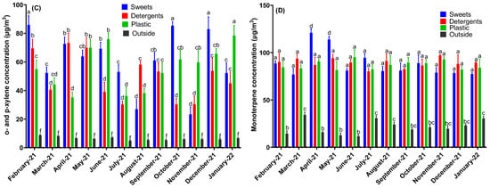 The annual average xylene concentration (Figure 4C) in the sweets department was 60.7 ± 20.7 µg/m3, in the detergents department was 49.4 ± 15.9 µg/m3, and in the plastics department was 56.0 ± 15.2 µg/m3. For almost all months, the concentration of xylene was higher in the sweets department than in the detergents and plastics departments (p < 0.05). The concentration of xylene outside was between 4.77 ± 0.48 µg/m3 in July and 8.65 ± 0.62 µg/m3 in January.