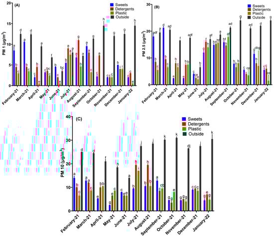 Monthly variations in PM1 (A), PM2.5 (B), and PM10 (C) concentrations over one-year measurements in 3 different departments and outside. Data with distinct characters indicate significant differences (p < 0.05), whereas data sharing identical symbols do not exhibit significant differences (p > 0.05). The values are averages of three independent measurements.