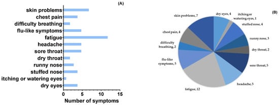 Thirty-one employees responded to our questionnaire, 22 (70.9%) females. The mean age of the group was 37.3 ± 10.4 years old (between 19 and 55 years). One subject was previously known for allergies, none of the subjects had an upper or lower airway infection in the previous week, and four reported concurrent diseases. Two of the four subjects with concurrent diseases reported six and eight symptoms, respectively, while the other two reported having only one symptom from the SBS list. Twenty-three (74%) subjects had at least one symptom, 25.8% had two to three symptoms, and four (12.9%) subjects had four or more symptoms. The median number of symptoms per patient was 1 (IQ range = 0.5–2.5, range: 0–8) (Figure 6A). Regarding the distribution of gender, a similar proportion of male subjects (77.7%) experienced symptoms compared to female subjects (72.7%) (p = 0.77). The employees reporting four or more symptoms were younger (median age 30 years old—range 26–45). The symptoms mentioned more often were fatigue (38.7%), skin problems (22.6%), throat-related issues (22.6%), headache, and flu-like symptoms (each reported by 16.1% of subjects), followed by dry eyes and chest pain (Figure 6B).