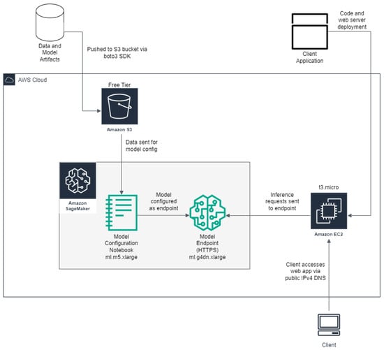 As in Figure 1, the dataset was stored in an Amazon S3 bucket to make it accessible via the cloud. Next, a SageMaker notebook instance was used to create the model endpoint, with a SageMaker endpoint to deploy the model.