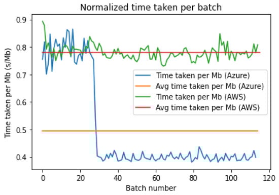 Figure 3 and Figure 4 show the time taken in seconds per mebibyte of data for each batch to be downloaded from the storage platform. The fluctuations are not due to the varying sizes of the batches since the data above were normalized by the batch size. In fact, these fluctuations can be attributed to the varying latencies to the storage bucket. However, an interesting trend can be seen in Figure 4 above, whereby there is a sharp drop in the download time per MB around the 30th batch, which reduces the average latency to lower than AWS.